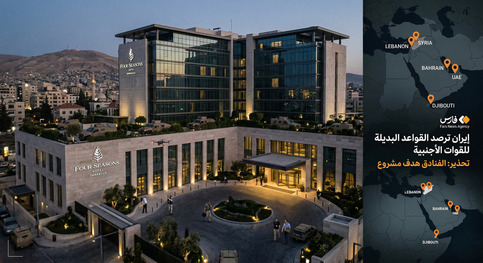 دمشق.. مقرات سيادية وفنادق تحت المجهر: وفي تفصيل مثير للجدل، ركز التقرير الإيراني على العاصمة السورية دمشق بشكل خاص، زاعماً رصد تحركات غير اعتيادية لاستغلال مواقع حساسة. وادعت الوكالة أن “القصر الجمهوري” السوري، إلى جانب فنادق كبرى وعالمية مثل فندقي “الفورسيزونز” و”الشيراتون”، تُستخدم حالياً كمقار آمنة وغرف عمليات لإيواء مستشارين وخبراء أمنيين وعسكريين تابعين للولايات المتحدة والاحتلال الإسرائيلي، وذلك لتجنب الاستهداف في القواعد العسكرية التقليدية.