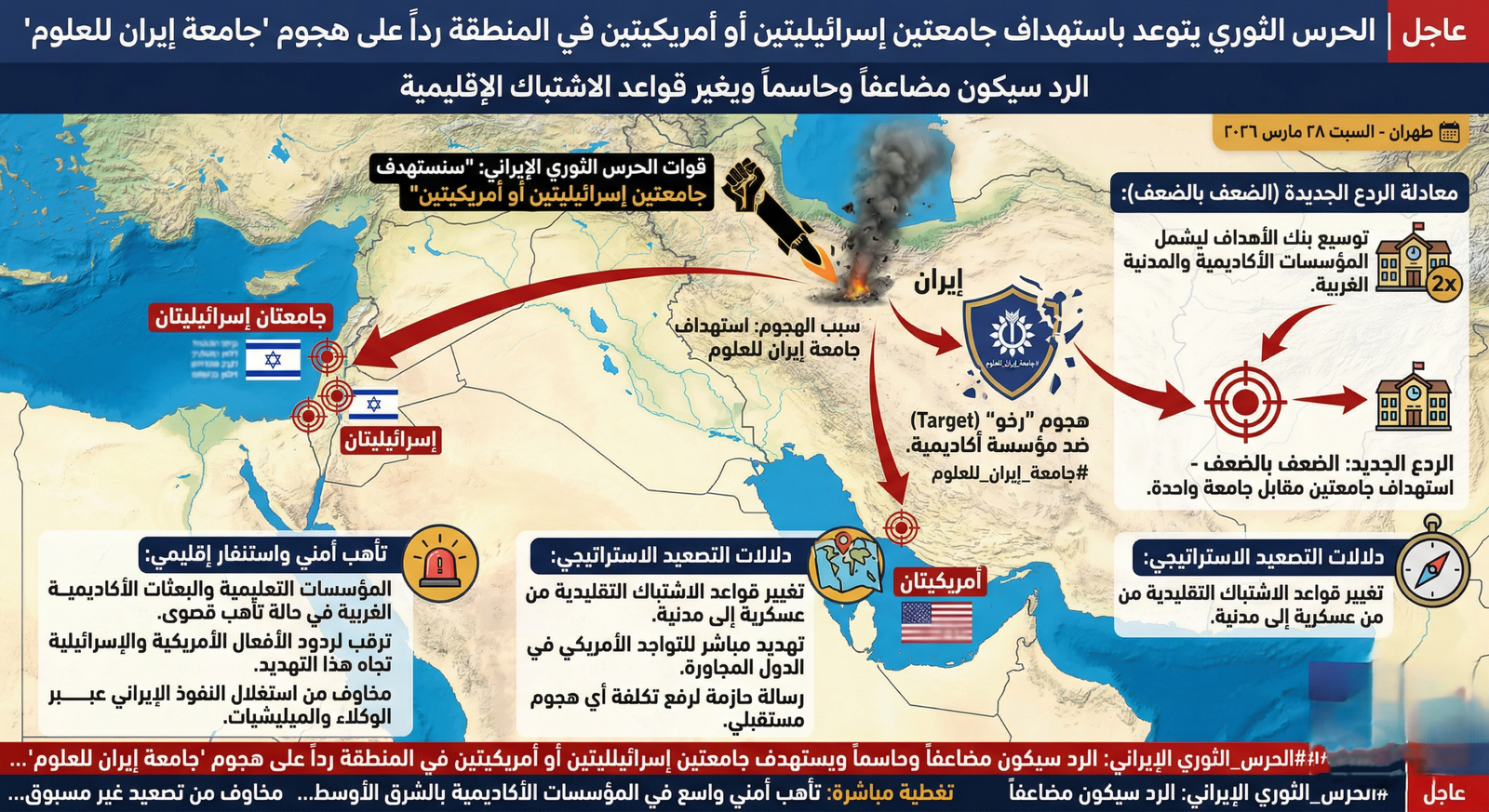 - معادلة الردع الجديدة (الضعف بالضعف): يحاول الحرس الثوري إرساء معادلة جديدة تقوم على الرد المضاعف (استهداف جامعتين مقابل جامعة واحدة)، في رسالة تهدف إلى رفع تكلفة أي هجمات مستقبلية ضد المصالح أو المؤسسات الإيرانية.