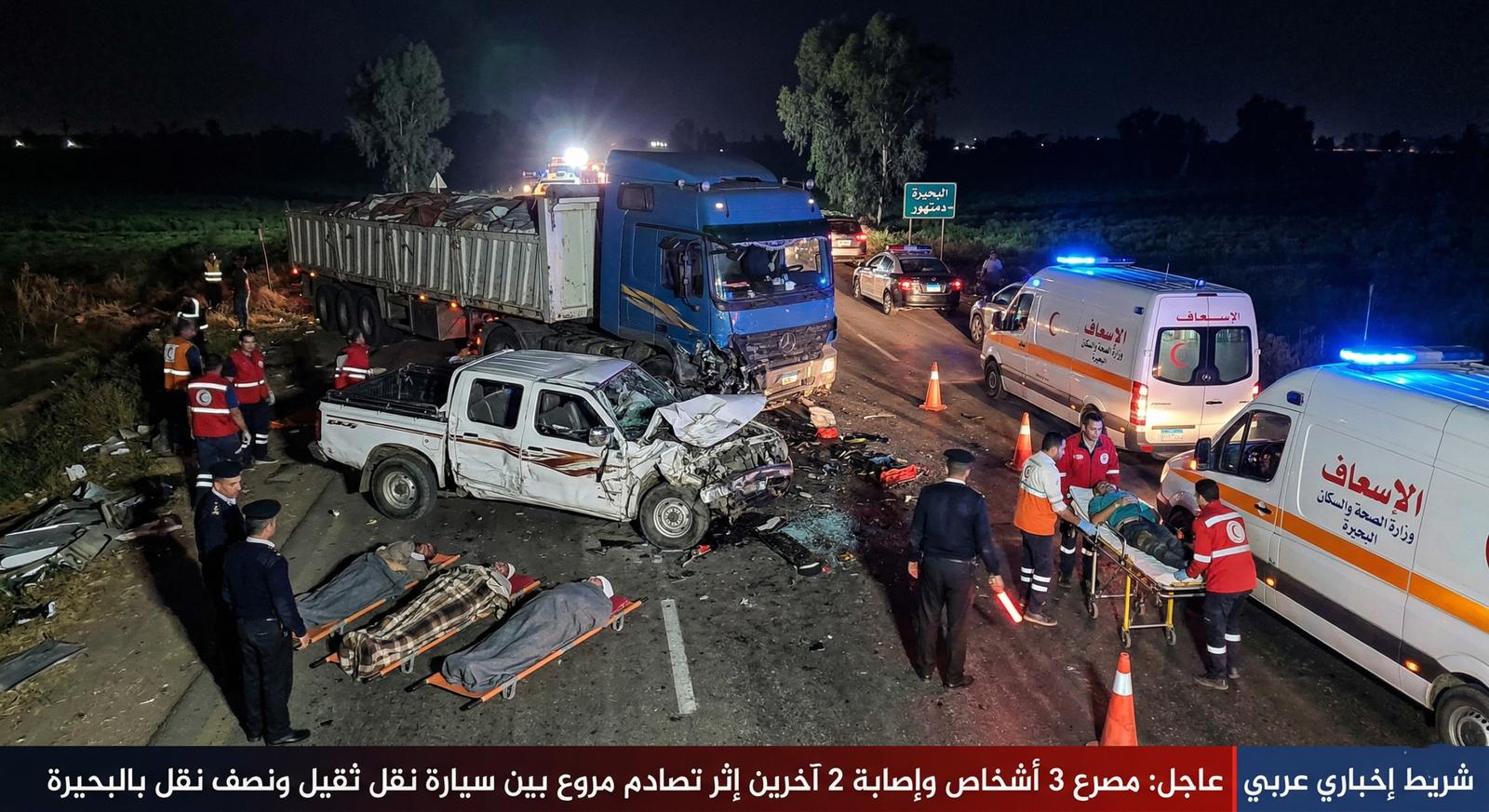 شهدت طرق محافظة البحيرة حادثاً مرورياً مأساوياً، أسفر عن مصرع 3 أشخاص وإصابة شخصين آخرين بجروح وكدمات متفرقة في أنحاء الجسد، وذلك إثر تصادم عنيف وقع بين سيارة نقل ثقيل وأخرى “نصف نقل”.