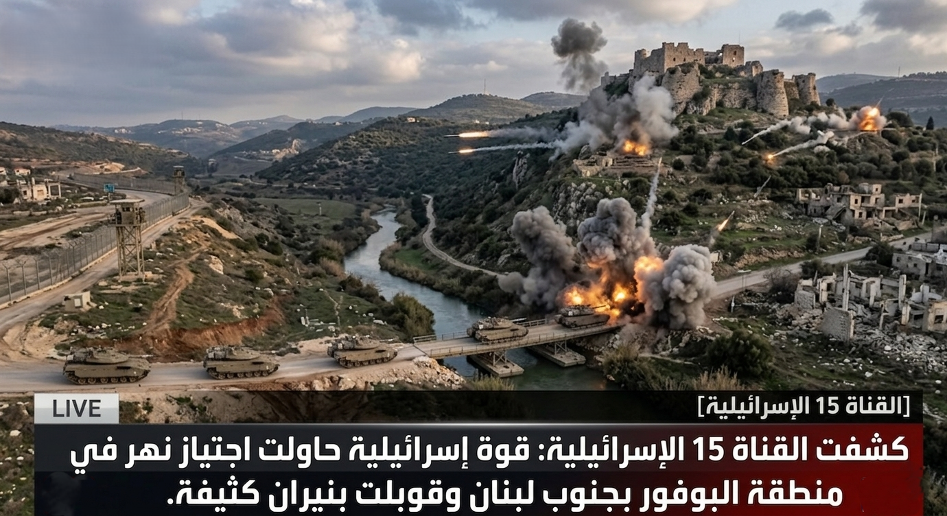 وكشفت “القناة 15 الإسرائيلية” في تقرير عاجل ومقتضب، أن قوة عسكرية إسرائيلية خاصة حاولت في ساعات متأخرة التسلل واجتياز أحد الأنهار في منطقة “البوفور” (المنطقة المحيطة بقلعة الشقيف التاريخية الاستراتيجية التي تطل على نهر الليطاني). وأكدت القناة أن هذه القوة المتسللة قوبلت بـ “نيران كثيفة جداً” من قبل مقاتلي حزب الله الذين كانوا يرصدون التحرك مسبقاً، مما أدى إلى إحباط عملية العبور بالكامل، وإجبار القوة الإسرائيلية على التراجع تحت غطاء ناري ومدفعي مكثف وسط أنباء عن وقوع إصابات دقيقة في صفوف الجنود.