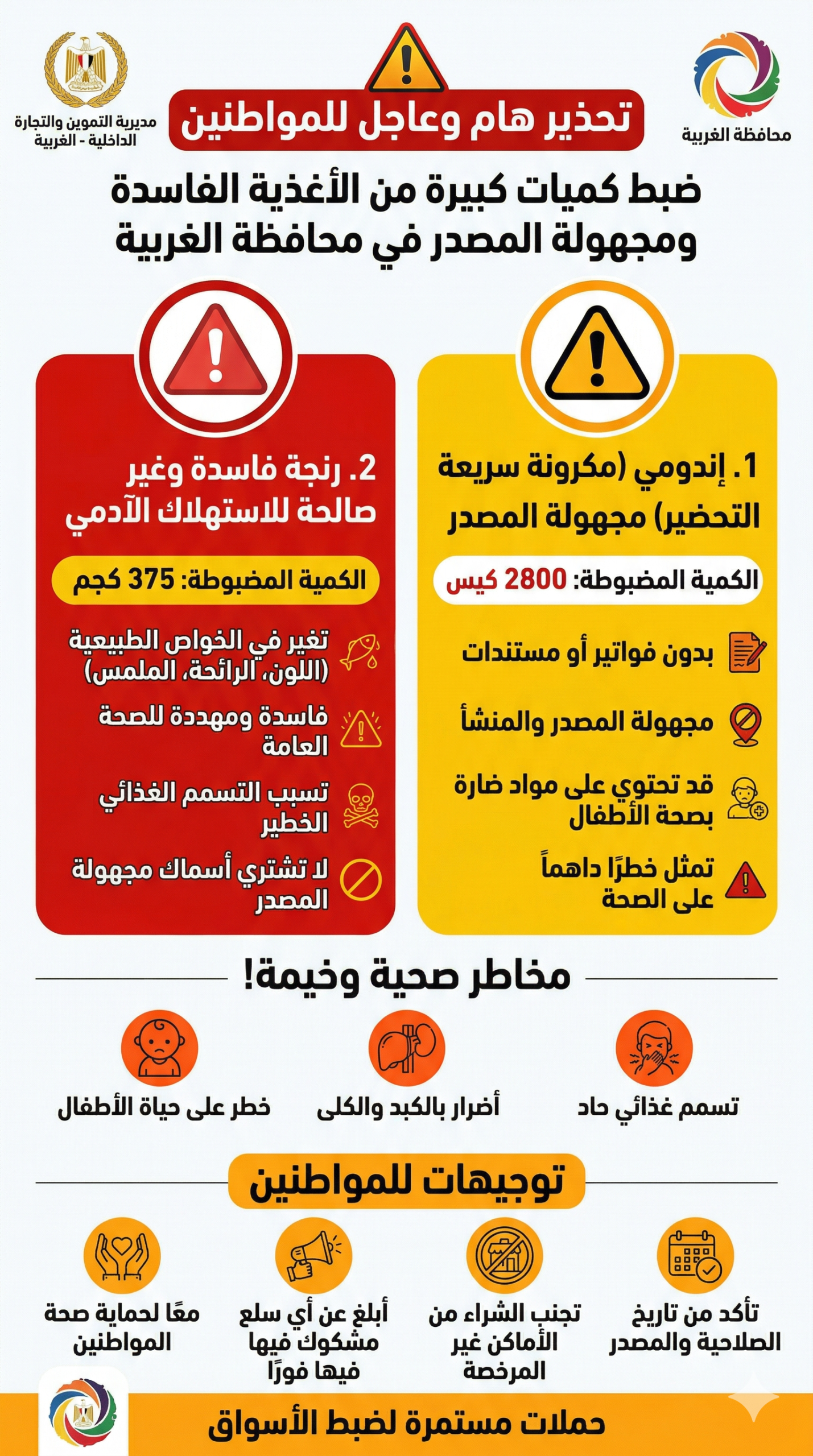 إحباط ترويج آلاف أكياس “الإندومي” المجهولة ومئات الكيلوجرامات من الرنجة الفاسدة بالغربية