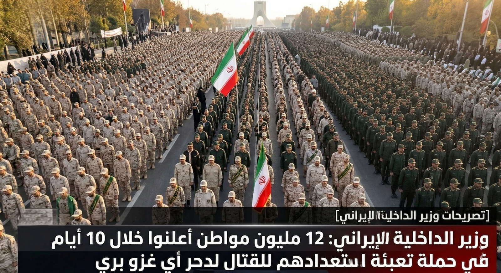 حيث كشف وزير الداخلية الإيراني، في بيان رسمي، أن حملة التعبئة الوطنية التي أُطلقت مؤخراً قد أسفرت عن تسجيل 12 مليون مواطن إيراني لأسمائهم خلال 10 أيام فقط. وأكد الوزير أن هذه الحشود المليونية أعلنت جهوزيتها التامة والمطلقة لحمل السلاح والانخراط في صفوف القتال لدحر أي محاولة لـ “الغزو البري” أو التوغل داخل الأراضي الإيرانية.